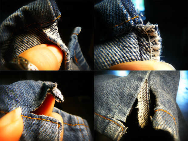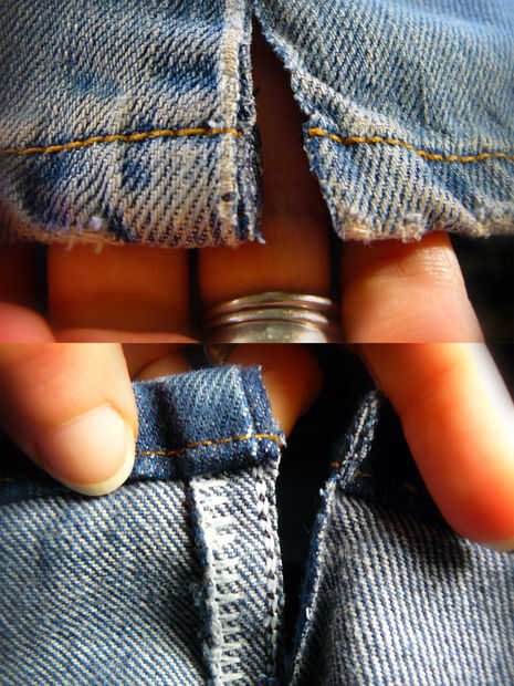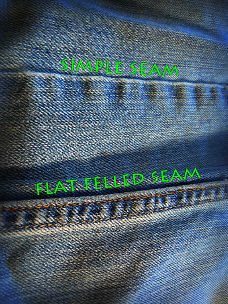 Seguir a la corte, la costura simple, por el lado de la pierna; en el yugo, por debajo de la costura; atrás de la pierna, contra costura sobrecosida plana (doble cosida); y a través del dobladillo.