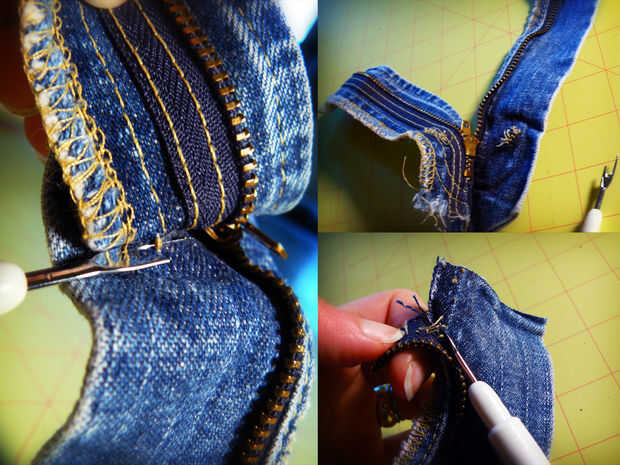 En la parte superior de cada lado de la cinta de la cremallera, tire de la cinta de marcha para exponer la costura y utilizar a su ripper para liberar la cinta de la cremallera. Generalmente, una vez que comenzó con un pequeño músculo, puede tirar más de la cinta libre, entonces utilizar al destripador para las algunas puntadas restantes en la parte inferior.