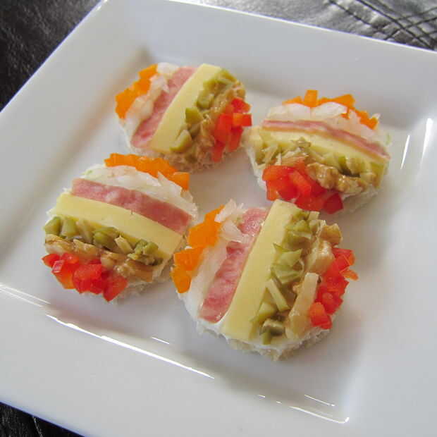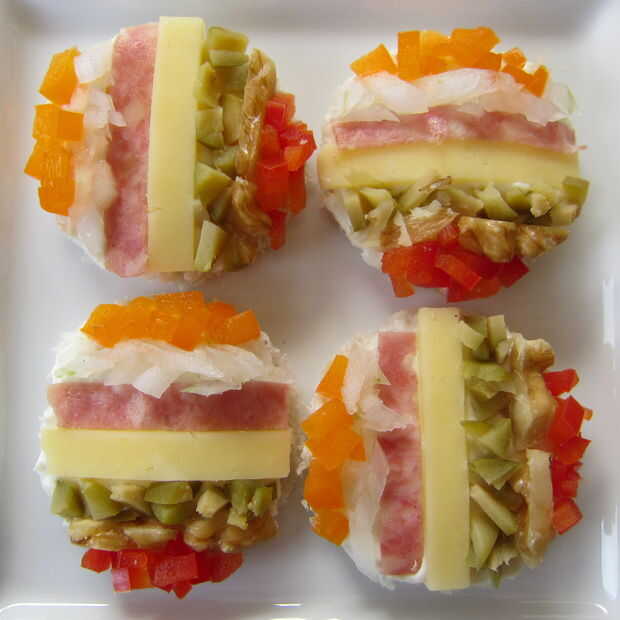 Estas mordeduras de bolas de queso son muy fáciles de hacer. Se necesita un cuchillo afilado para cortar las verduras muy pequeñas.