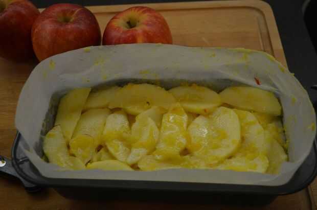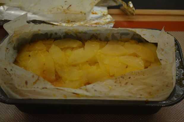 Repita el proceso hasta que el molde está lleno de manzanas hasta 1 / de pulgada por encima del borde. Cubrir con papel de hornear, luego envolver con papel de aluminio.