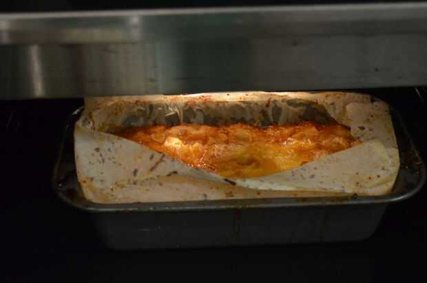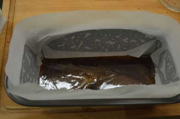 Engrasar un molde de pan con mantequilla. Lados de la línea de la cacerola con papel de hornear. Precalentar el horno a 350° F.