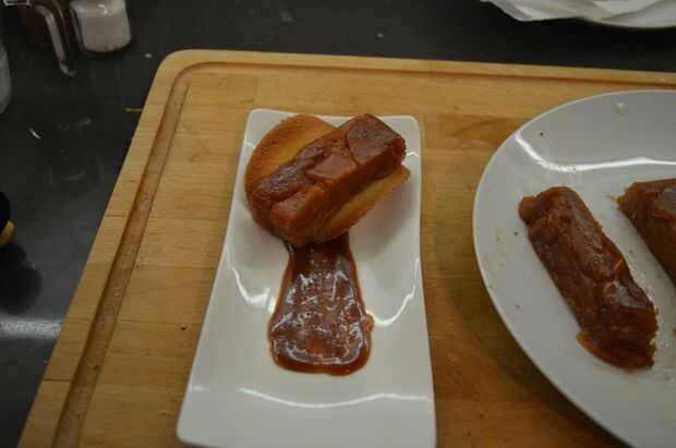 1. Pase un cuchillo alrededor de fuera de la manzana confitada para aflojar los lados. Sumerja el pan en agua caliente para aflojar el caramelo en el fondo. Luego girar la manzana confitada sobre una tabla para picar. Cortar en rebanadas ancho 1 pulgada.