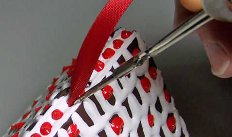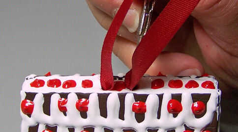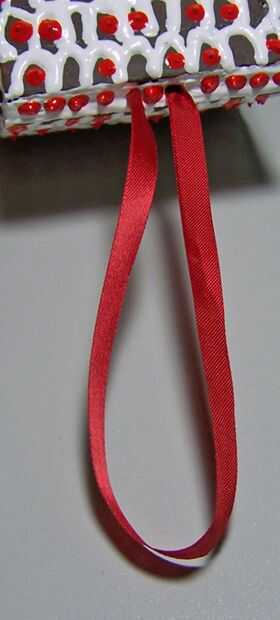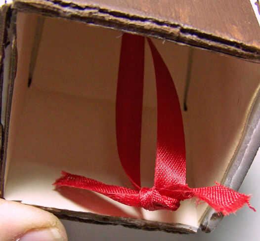 Pase los dos extremos a través de la casa hasta que la cinta cumple con la línea del tejado. Coinciden con los extremos y atar en un nudo cuadrado.