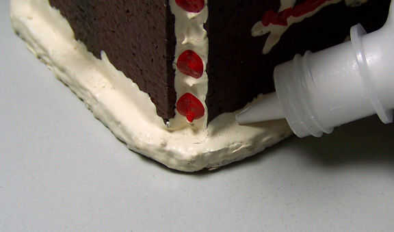 Poner la casa en el centro. Apriete blanco arte pintura a lo largo del borde inferior de la casa para simular nieve y pegar a la base. Apartar durante doce horas permitir que la pintura se seque.