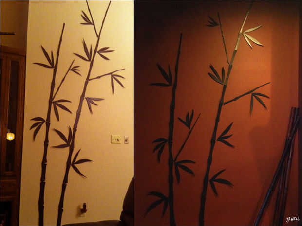 Añadir una o dos que tiras de comandos detrás de las decoraciones de Junta de espuma y colocarlos en tu pared! He podido colocar las piezas de decoración de bambú en nuestro muro (izquierda) de la casa y eliminarlos para instalar en nuestro nuevo hogar (derecha). Sólo tenga cuidado y siga las instrucciones de las tiras de comando para eliminarlos con seguridad :)