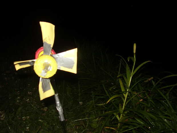 hecho! Si usted protege las plumas bastante apretadas, podrás pegarlo en el suelo y permanecerá. Si se inclina (probablemente será) añadir más cinta hasta que funciona. no estoy seguro de lo bien gira en el viento, pero si se sopla en él de la derecha hacer girar como un loco.