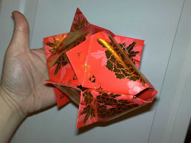 Escoja dos esquinas de cada uno de los bolsillos rojos colgando y grapa en la esquina de los bolsillos rojos adyacentes.