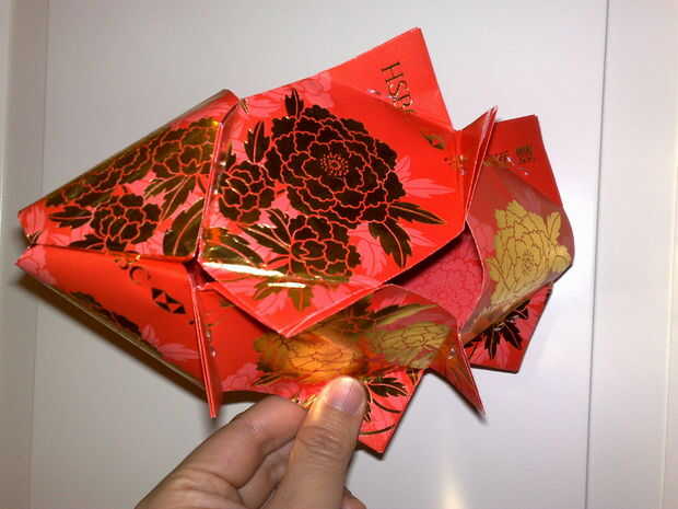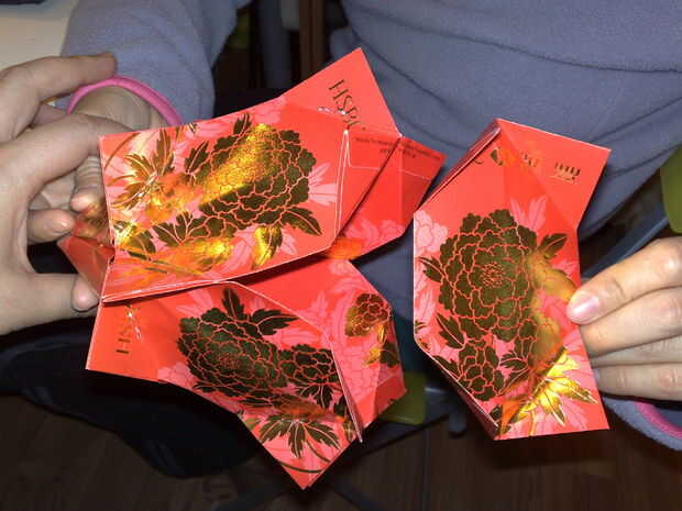 Engrape las esquinas de los bolsillos rojo recién conectados juntos.