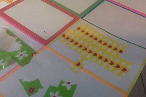 Utilizar cualquier color que desea utilizar. Estoy utilizando esta cinta amarilla, corazón, que creo que se ve realmente bien. Esta es la segunda vez que lo hago, lo he hecho con verde antes. Un Consejo: use cinta de washi de color arco iris, que puede parecer agradable! Asegúrese de cubrir el contorno de todo en este paso. Está bien si usted no puede ver el esquema, como todavía se puede ver en la parte posterior de la hoja de etiquetas.
