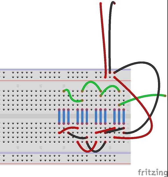 Los cables rojos conectan todos los nodos que tienen el poder. Los cables negros conectan todos los nodos que han y el verde (en la imagen de Fritzing) o blanco (en la placa física) Conecte todos los nodos que deben ser datos.