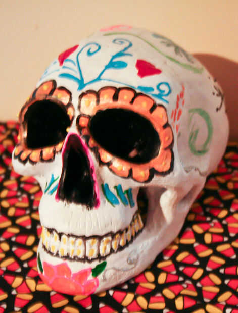 Siempre he amado la estética de calaveras de azúcar y lo que representan. Yo quería crear algo inspirado en el día de los muertos para Halloween.Tuvimos algunos cuero sobrante de unas sillas, que quería reutilizar. Este es mi primer intento de crear