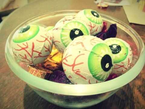 quieres una simple decoración de Halloween barata,.Lo que se necesita;-Bola de espuma de poliestireno de almacén del dólar-Globos oculares gumball de Walmart-PegamentoSimple;Pegar chicles en bola de espuma de poliestireno.