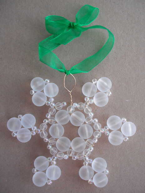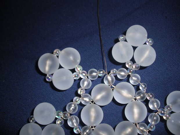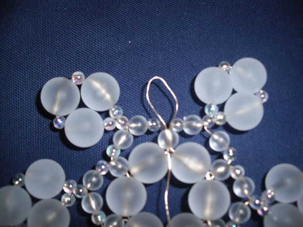 Con las cuentas que he usado aquí, los extremos del cable ahora se pueden cortar con cortadores de alambre, tijeras, o cortauñas, si usted no lo ha hecho. Sin embargo, al usar cuentas con agujeros más grandes, he encontrado que el copo de nieve puede ser un poco flojo, en cuyo caso, enrosque los extremos a través de algunas perlas más hasta que se sienta seguro.