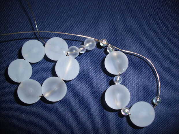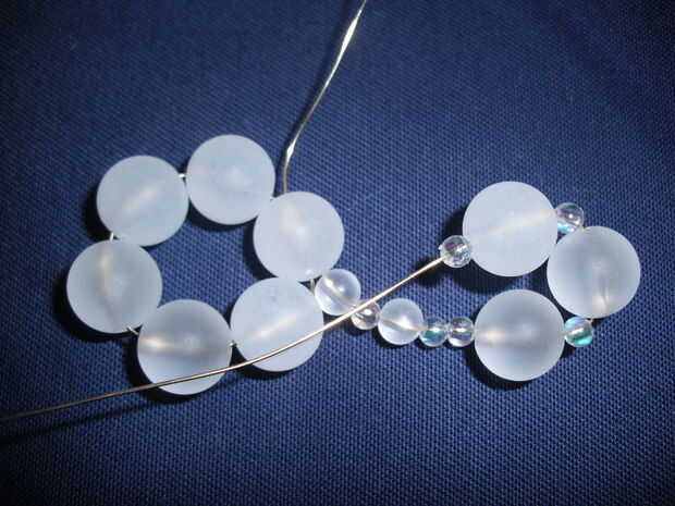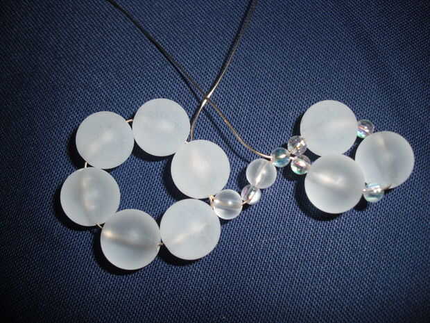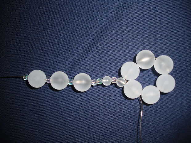 Haga un bucle enroscando el alambre a través de la pequeña cantidad marcado con asteriscos (de los dos granos pequeños juntos es el más cercano al centro de copo de nieve). Me encuentro haciendo el bucle más fácil si doblar el alambre y haz las cuentas donde usted quiere antes de enhebrar el alambre a través de bolas de 4mm.