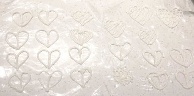 •Feel gratis para crear cualquier tipo de corazón que desee y sea creativo! También hice corazones tapete (dibuje una forma de corazón, entonces deja que el chocolate blanco cae en garabatos al azar para llenar el corazón), cubierto de corazones (llena un corazón haciendo una línea de zig-zag-como) y más. Terminé de fusión demasiado chocolate así que me aburrí de corazones de tuberías y muchas otras formas como los copos de nieve, cartas, varitas y Tinkerbell!