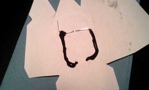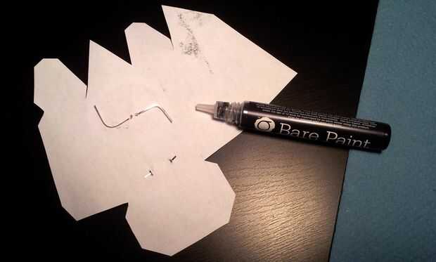 Asegúrese de que el positivo del LED (pata larga) va al positivo de la batería. Dibujar en el circuito en la parte posterior de la plantilla usando su desnuda pintura pluma.  Asegúrese de no cortocircuitar los componentes.