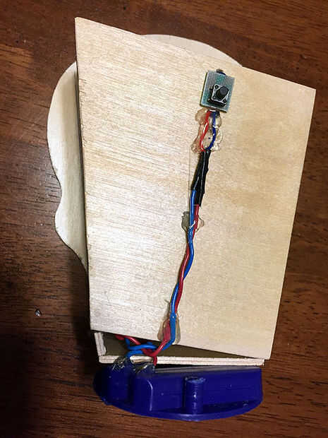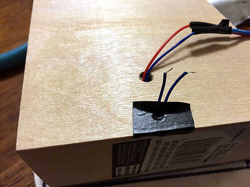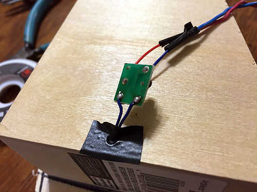 Mantenga los cables azules cortos en su lugar con cinta adhesiva mientras se suelda el interruptor en su lugar. No te preocupes sobre orientación, cualquiera de los cables puede ir a cualquier lugar en el interruptor. Pegamento caliente el interruptor en la parte posterior de la caja cerca del agujero de los cables pasan a través.