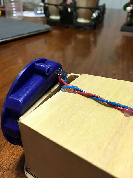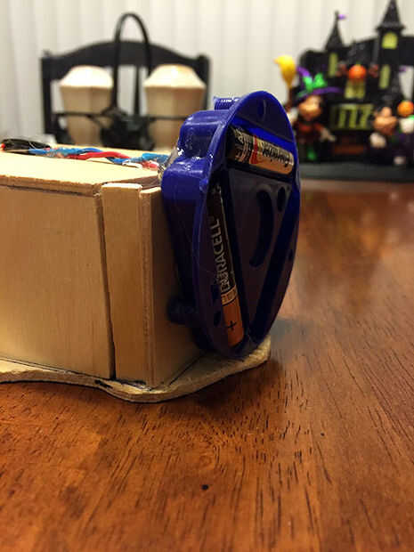 Utilice pegamento caliente para fijar la caja de batería en la parte inferior de la caja ligera de la calavera. Utilice pegamento caliente para unir los cables cuidadosamente en la parte posterior de la caja de luz. carga con tres pilas AAA y utilice el tornillo de paso 11 para volver a colocar la tapa de la caja.