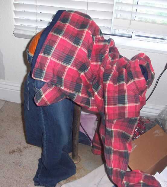 4 calabazas juntos a booty forma pegamento. Botín de pegamento para pvc y apoyar. T. Tire los pantalones con cinturón de botín y seguro y t-estaca con alambre. Poner la camisa sobre la columna vertebral y los hombros. Materia cuerpo attatch a columna vertebral con el alambre si nessessary. Brazos de cosas. Guantes de pegamento al final de los brazos. Tire de los brazos en la posición deseada y pegamento.