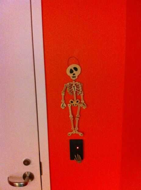 con alguna cinta, una escalera y algunas fuentes de Halloween comprados te pueden crear un astonoshing y decoración de halloween de miedo. Tomar ventaja de oscuros pasillos, pasadizos secretos, etc.. Este proyecto se realizó en el puente que une a 2 oficinas de Autodesk en San Francisco - el edificio más nuevo de Steuart Tower y el edificio más viejo.