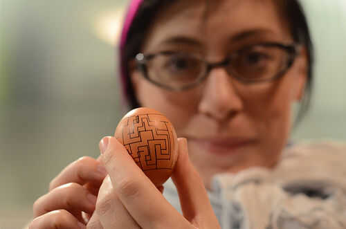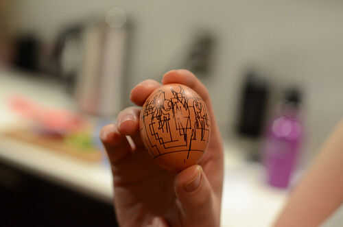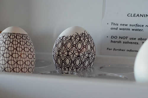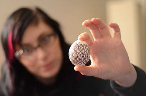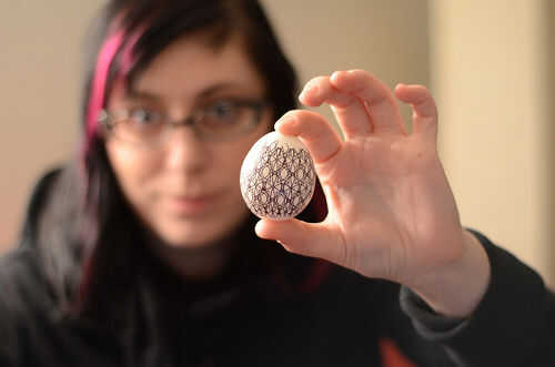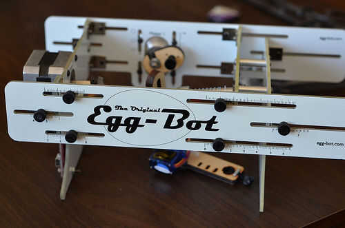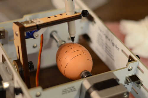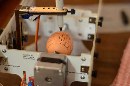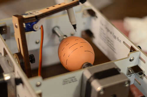 Como se puede ver en las fotos, necesita colocar su huevo dentro de la máquina y calibrarlo adecuadamente utilizando plugin del huevo-Bot para Inkscape para asegurar que la pluma siempre golpea el huevo como su diseño es absorbido. Definitivamente es un arte para hacerlo bien. Estas fotos son de mi primer intentos y pruebas, algunas de las cuales resultaron mejor que otros.