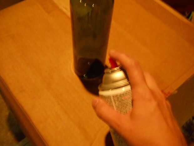Le recomiendo limpiar la botella antes de rociar con alcohol. Ayuda a la pintura a pegarse al cristal un poco mejor.