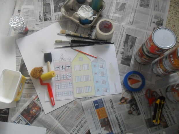 pintar un árbol grande, con casas y aire caliente globos en el fondo.  Usé pintura de látex, pinceles, esponjas y rodillos de pintura.