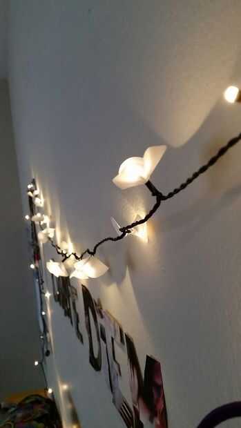 I encontró este filamento para cerca de $12 en ikea y luego cortar círculos de papel pequeño, cortar una x en el centro y ponerlo sobre la luz para que se vea como las flores.