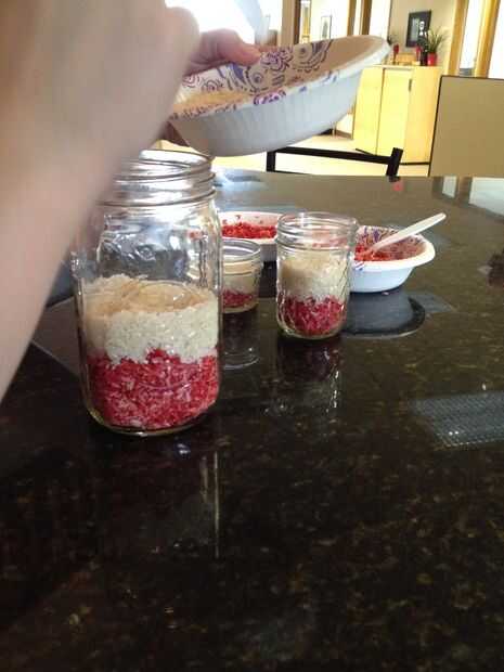 Una vez que el arroz estaba seco nos capas el rojo, el blanco (llano) y el arroz azul para crear un aspecto festivo. Hay dos muy buenas opciones con estas velas, usted tampoco puede llenarlo todo el camino hasta la parte superior (como se hizo) la mitad. Creo que la segunda mirada crea un resplandor más romántico.