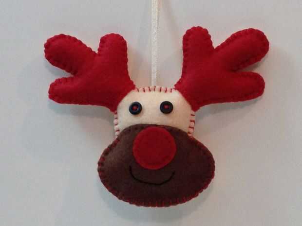 La decoración está hecha de tela de fieltro y se rellena ligeramente para dar un efecto 3D. Utiliza puntadas de bordado para decorar la superficie y juntar los bordes. La decoración de Reno también viene con una pequeña cinta que puede ser colgado.