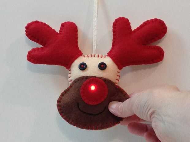 Decorar tu casa esta Navidad con Reno favorito de todos: con que famosa nariz roja! Hacer la nariz brillan incluso más brillante mediante el uso de un LED de la PCB que se encuentra bajo la tela y se enciende cuando tienes el empuje el interruptor oculto en la mejilla.