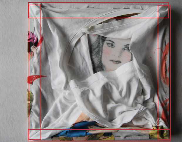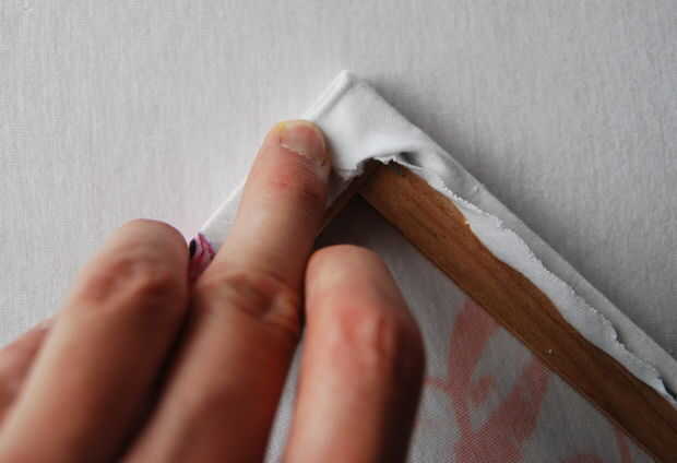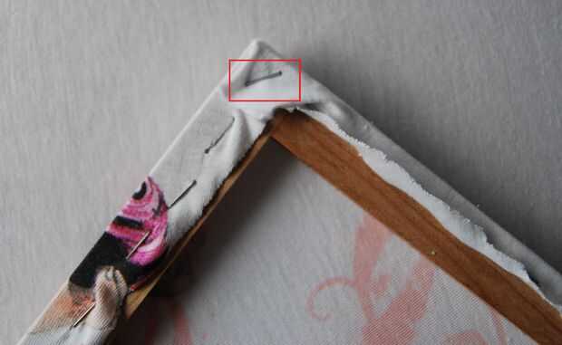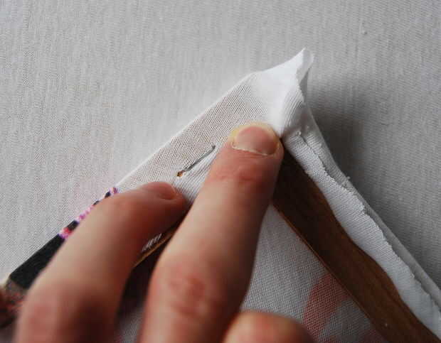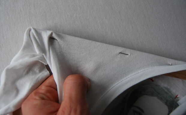 Esquina izquierda superior : Para sujetar las esquinas, tire de la parte izquierda de la camiseta a la derecha y la pieza superior de la camiseta hacia abajo. Asegurar la esquina ahora con una grapa. Deslice el bastidor 90 grados hacia la izquierda y lo mismo para este rincón. Hacer esto para todas las 4 esquinas.