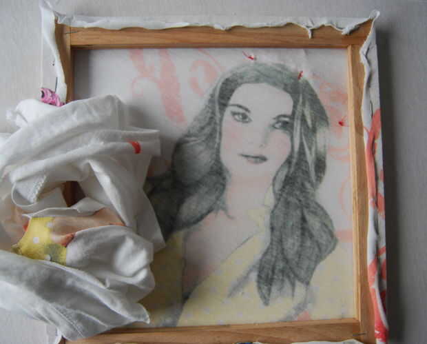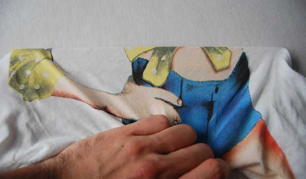 Lado izquierdo: Tirar de la camiseta un poco a la izquierda y hacia abajo. En la parte posterior del bastidor puede sujetar la camiseta con 3 grapas.