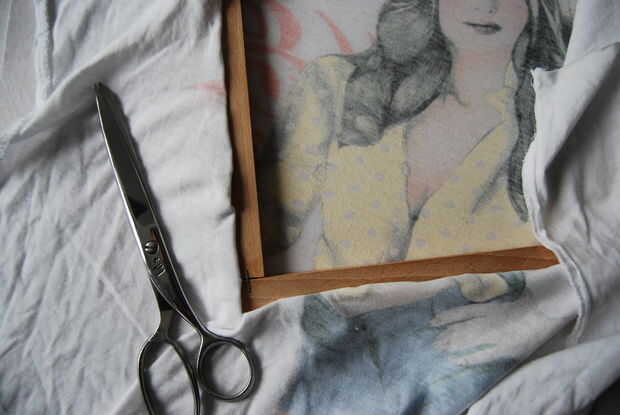 Entre las grapas es espacio, tirar en este punto la camiseta firmemente y asegúrela con unas grapas. Hacer esto en todos los lugares donde la camiseta cuelgue suelto. Cut el restante material del armazón