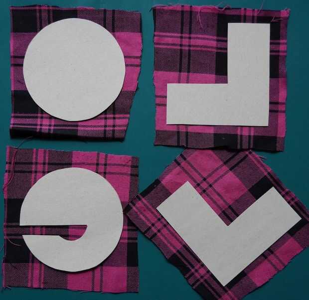 Tenía algo de tela de pantalones viejos de mi hija y cortar 4 cuadrados un poco más grande que 4 x 4 pulgadas para tener suficiente tela para doblar detrás de la letra de cartulina.