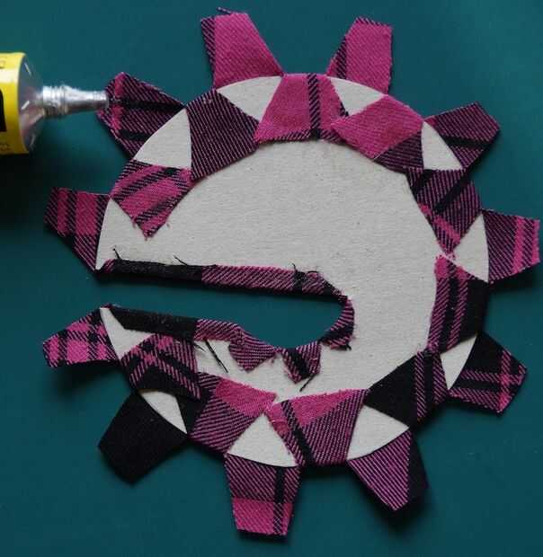 Para la letra "e" cortar a la tela siguiendo el círculo a una distancia de aproximadamente 1,5 cm (alrededor de 0,6) y luego cortar a la tela en pestañas alrededor del círculo y pegado en una prestar atención de manera que suficiente tensión fue dado a las fichas para que la tela se quedó plana en la superficie derecha de la letra para evitar las arrugas. Usé pegamento líquido porque quería las lengüetas para ser totalmente pegado a la parte posterior de la carta y pensé que sería un poco arriesgado para los dedos con pegamento caliente.