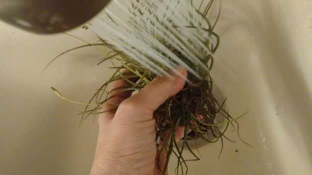 Dar a su planta de aire un muy buen enjuague. Habrá hojas y suciedad entre sus pequeñas hojas coriáceas y posiblemente un error o dos, aunque generalmente son bastante limpios a menos que han estado en el suelo por un tiempo. Los enjuago hasta que el agua salga limpia. Lo mismo para la shell o cualquier otro artículo te está usando para percha de su planta de aire.