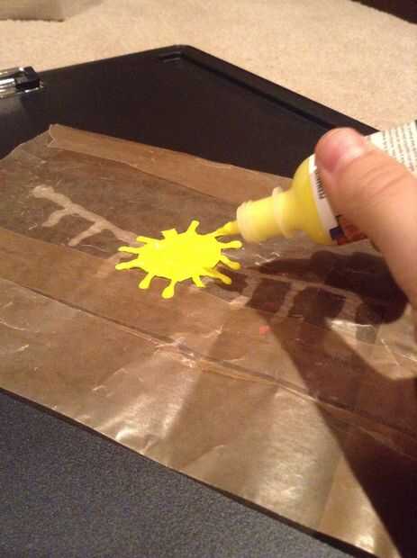 En el papel de cera Inicio elaboración de diseños con la pintura puffy como estrellas, el sol, la tierra o cualquier cosa quieres.