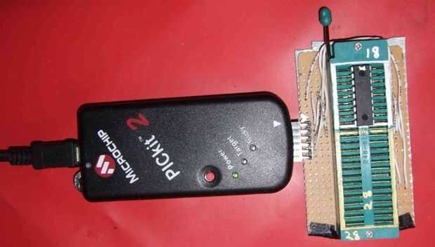 Usé un programador de Microchip "PICkit2" conectado a mi casera adaptador del zócalo ZIF que se muestra en la foto. (No proporciono cualquier conexión programación en-circuito pcb.)