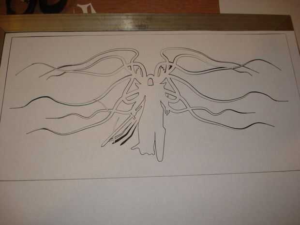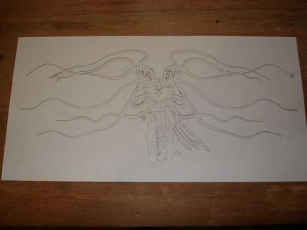 Comience con la hoja frontal de la decoración (no tiene agujeros en él y es sólo un pedazo del tamaño de papel). Pegamento de la capa más oscura a esta hoja frontal. Contará con la mayoría del material dejado en él para que peguen todo en la parte delantera.