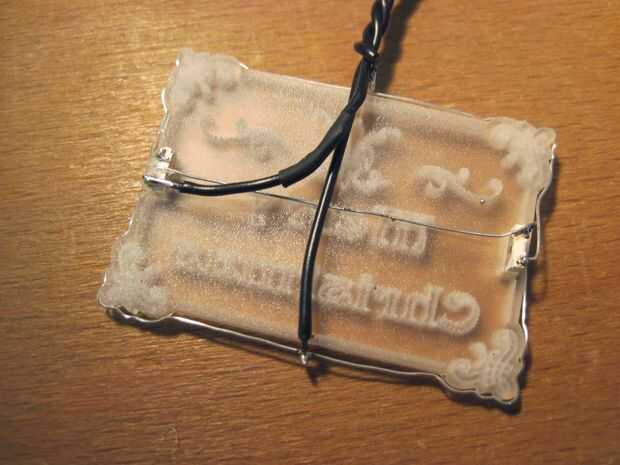 Un alambre de plata puede ir por el borde inferior de la muestra (suelo, el "triángulo-pad"), otro en el borde superior (VCC, la almohadilla de enfrente). Ambos construyen una especie de marco adicional. Todavía una falta de alambre - conectar datos a partir de un WS2812B con los datos de la otra con un cable recto por encima de la parte posterior de la muestra.