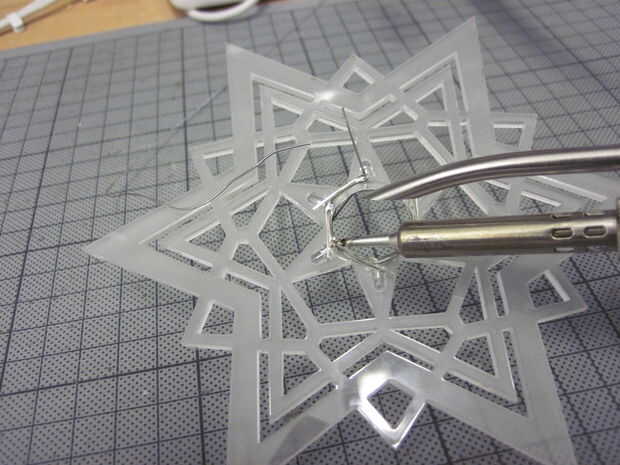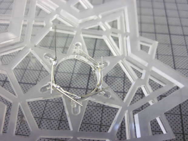 Luego doblar cada pierna en un lado hacia el vecino, envuélvalo alrededor de ella y fijar con soldadura. Cortar el resto de la pierna - pero si usted utiliza una célula de la moneda en el centro (ver siguiente paso), mantenga la pierna pasada como conector de la batería.