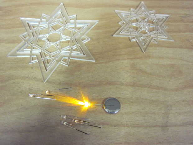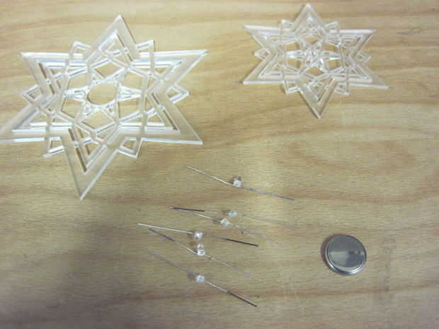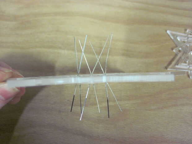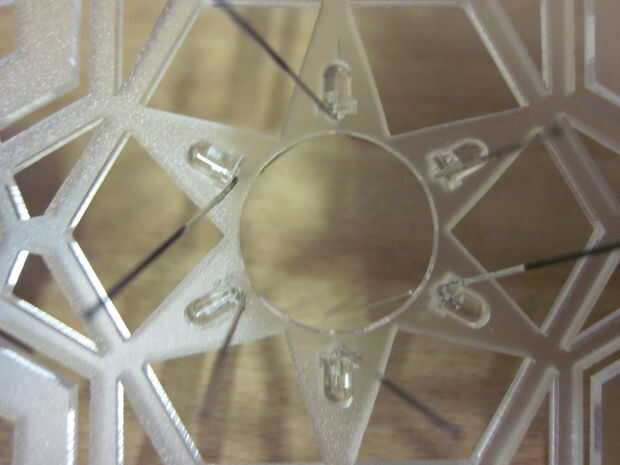 Primero doblar cada pata del LED en un ángulo de 90° e insertarlos en el recorte. Sólo asegúrese de que el ánodo y el cátodo de cada LED puntos siempre en la misma dirección. Marcarlos con un edding antes de doblar, esto facilita las cosas.