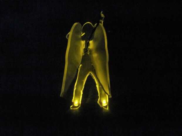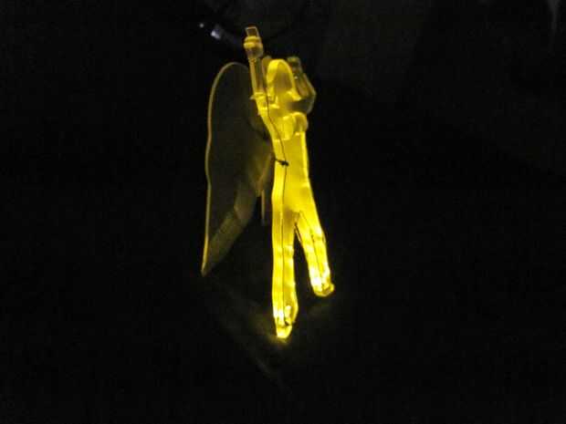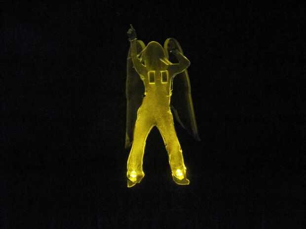 Insertar las alas (que ambos son doblados en dirección opuesta) y por ejemplo dos LEDs en las piernas. El cable sigue la forma exterior del cuerpo hasta los brazos a las manos, donde forman una especie de pulsera (una pierna / / brazo lateral para el positivo, el otro de tensión negativa).
