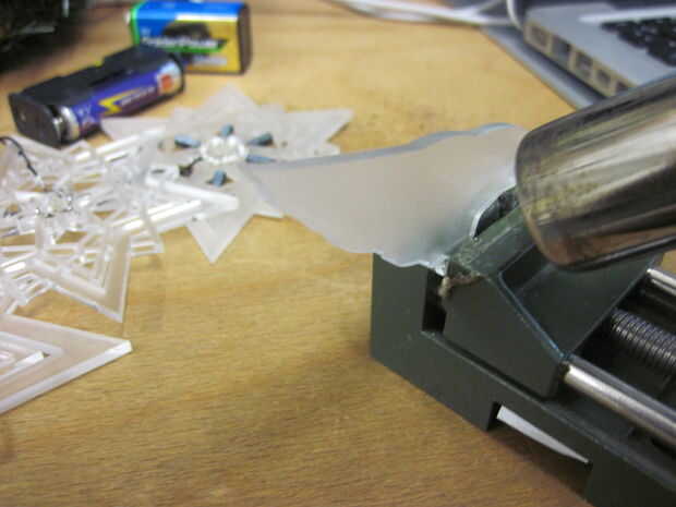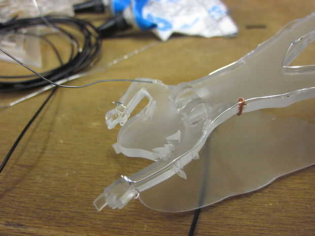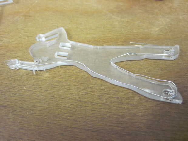Las dos alas cortadas a láser deben tener una extensión de 5mm para la inserción en el cuerpo. Esta parte de la abrazadera y calentar el ala con una pistola de aire caliente. Después de un tiempo puede doblar el ala detrás de esta extensión en un ángulo de 45°.