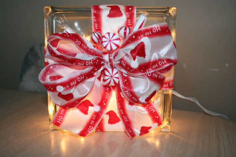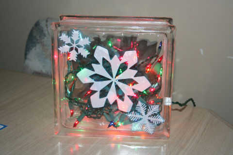 Utilice un bloque de edificio de cristal para hacer una decoración, taladrar un agujero e insertando las luces de Navidad, luego agregar algunas decoraciones en la parte exterior del bloque.