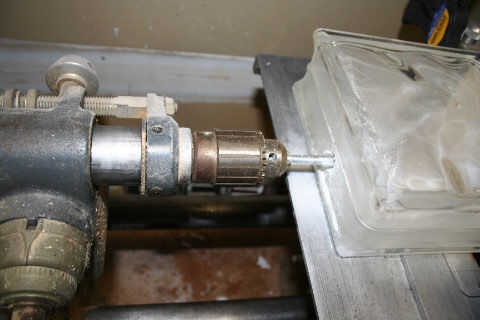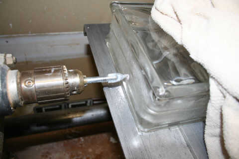 Tomarlo agradable y lento con este paso. El vidrio puede y hará añicos si no cuidado. Asegúrese de que la broca se mantiene fresca por goteo o aspersión agua en la broca como son perforación. Si no está sujeta al bock de vidrio, utilice una toalla y un guante para sostener el bloque hacia abajo. No quieren que nadie lastimado.