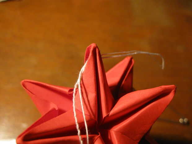 Hacer un pequeño agujero en una de las cumbres de la estrella y la cadena en. Hacer un nudo y listo!