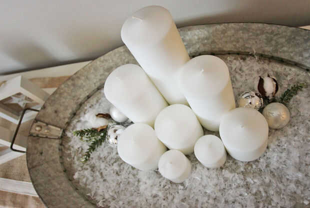 Esta bandeja galvanizada con velas blancas, se mantiene a lo largo del año. Para crear un aspecto festivo añadí nieve sintética, pequeños adornos de plata, verde y ramitas de algodón.