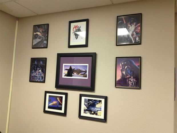 a continuación se coloca simétricamente una pared con arte de Star Wars. Creo que algunos de ellos están demasiado cerca entre sí, pero yo no he tomado el tiempo para rehacerlos. La imagen del centro es una litografía de un cliente. Así que fue llevado con mi oficina originalmente que dijo que vio la obra y sabía que tenía que comprar para mí. Buen chico.